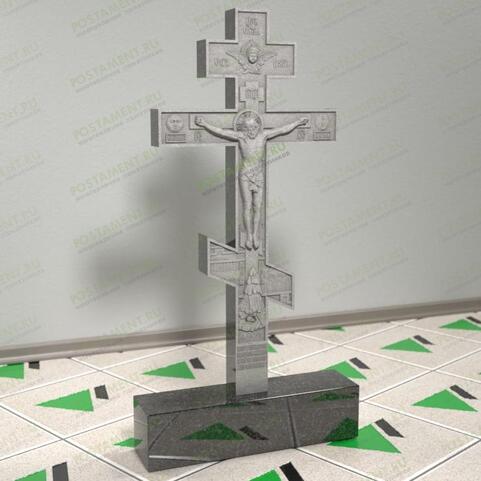 Очень красивый памятник в виде восьмиконечного креста с распятием Иисуса Христа и другими резными деталями. Этот памятник для тех, кто верил в Бога, для кого Вера была не пустым звуком, кто невзирая на трудности, шёл к победе над собой, и умер в стремлении к лучшему. Изготовлен из габбро-диабаза, но можно сделать его из гранита или мрамора. Для фото и надписей заказывают табличку из гранита или мрамора (на ножках).