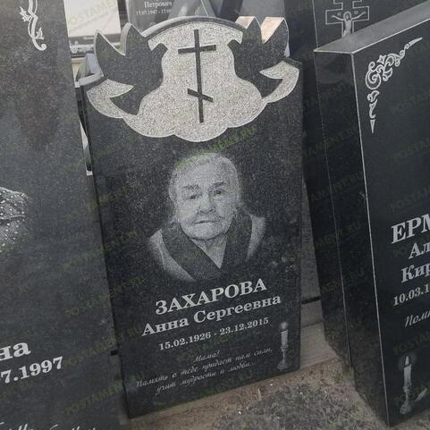 Черная вертикальная стела похожа на высокую скалу, верхушка которой закрыта белым облаком. На его фоне эффектно выделяются резные изображения двух птиц (голубей) и православного креста между ними – все черного цвета.