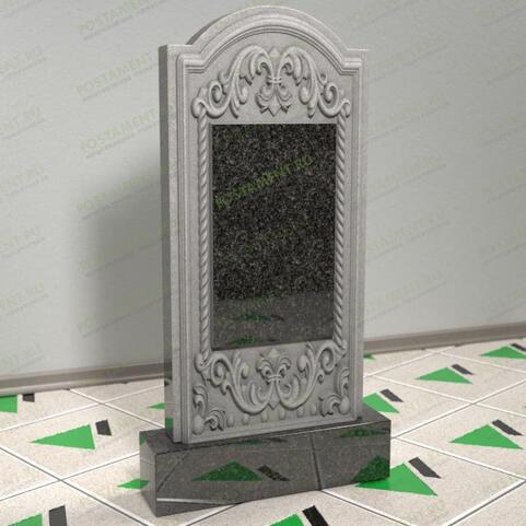 Красивый дизайн вертикальной стелы с вершиной в виде арки, привлекает внимание прохожих. Объёмная резьба, выполненная на светлой поверхности, обработанной фрезерным станком, красиво обрамляет полированный прямоугольник. Этот чёрный островок в центре композиции идеально подходит для гравировки портрета и надписей. Полукруглый фигурный верх декорирован вырезанной из камня выступающей фаской, добавляющей дополнительный объём композиции. Такие модели памятников используют на одиночных женских и мужских могилах.