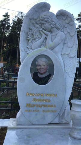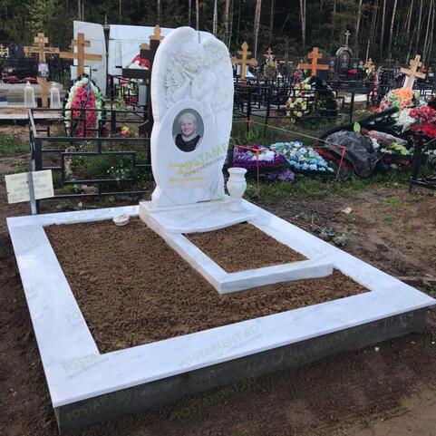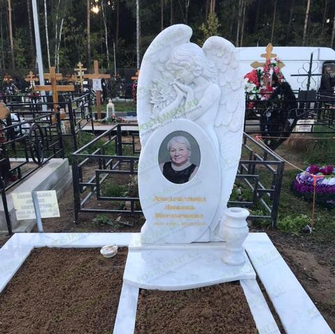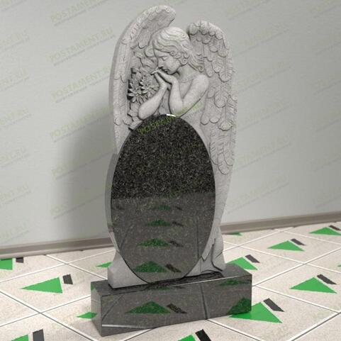 Великолепный памятник, с красивым, резным ангелом, никого не оставит равнодушным. Овальную стелу, напоминающую зеркало, установленное на постаменте, придерживает вырезанный из того же камня, скорбящий ангел, стоящий за стелой. Он прикрывает крыльями памятник, как будто оберегает от невзгод. Под защитой такого ангела спят вечным сном те, кто был особенно дорог и любим. Такую модель памятника заказывают для детских, женских и мужских захоронений.