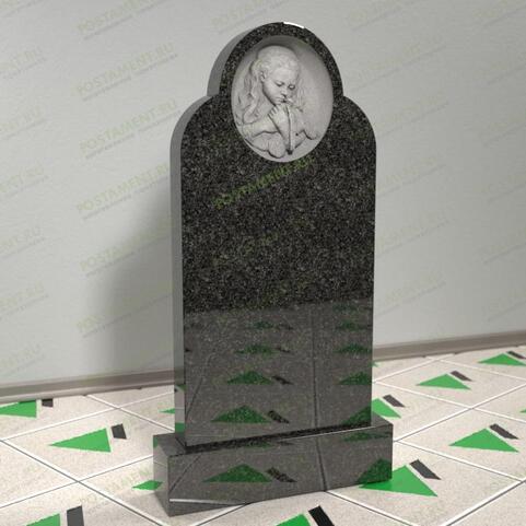 Изящный памятник с резным барельефом, изображающем девочку с голубем в руках. Барельеф выполнен в верху стелы. Он размещён в круглой рамке. По желанию заказчика может быть выполнен барельеф, изображающий усопшего. Голубь является символом души, стремящейся обрести вечный покой на небесах. Резной барельеф выполнен в светлом, сером цвете, он очень красиво смотрится на фоне чёрного, до блеска отполированного габбро-диабаза.