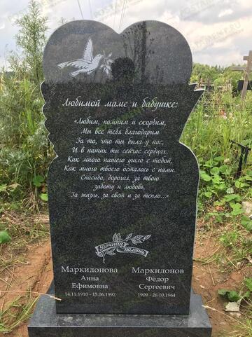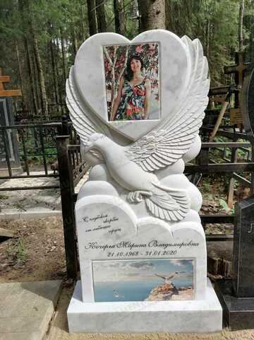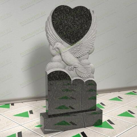 Фигурный, резной памятник с голубем в небесах, поддерживающем крыльями большое сердце. Голубь – это верность, нежная любовь, чистая душа. Сердце говорит о большой скорби и долгой памяти. Усопший продолжает жить в сердцах тех, кому он (она) был дорог. Такое надгробие позволит показать чистоту души почившего и пронести его светлый образ через года. Устанавливают на детские, женские и мужские захоронения.