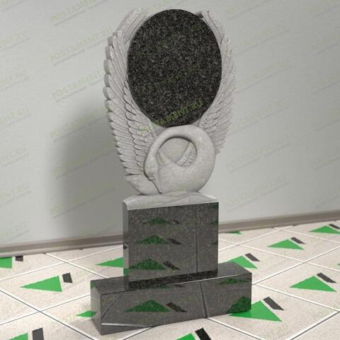 Прекрасный, фигурный памятник на могилу, из монолитного куска габбро-диабаза, зрительно поделён на три равных части. Нижняя часть – зеркально отполированный постамент, на котором достаточно места, для нанесения надписей и короткой эпитафии. Средняя часть – прекрасный, резной лебедь. Он печально склонил голову, и поднял вверх крылья, как будто собираясь взлететь. Третья, верхняя часть – зеркальный, чёрный овал, в обрамлении лебединых крыльев. Это готовая рамка для портрета усопшего. Такую универсальную модель можно устанавливать на любых захоронениях: женских, мужских, детских.