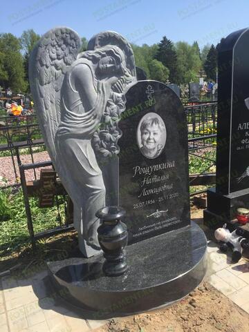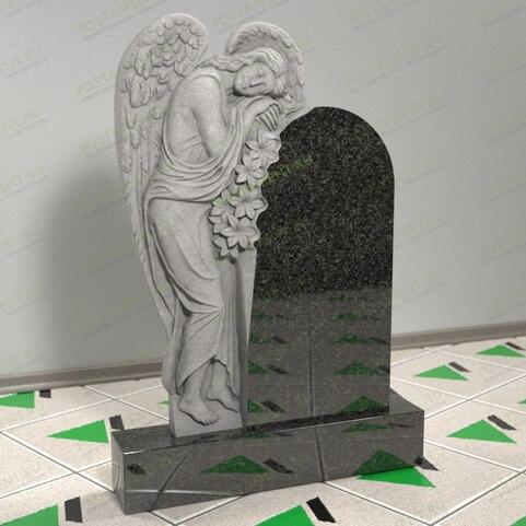 Резная скульптура умиротворённого ангела с цветами, приклонившего голову к каменной, зеркальной стеле. Посланник Господа закрыл глаза и сложил крылья. Он охраняет душу покойного и скорбит о нём. Резная статуя на могилу выполнена в полный рост. Светлая фигура выразительно контрастирует на фоне чёрного полированного надгробия, придаёт композиции глубокий, символический смысл. Такой памятник на могилу подойдёт для благоустройства детских захоронений, молодых девушек, взрослых женщин.