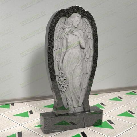 Фигура небесного ангела вырезана внутри фигурной стелы. Она как будто «заключена» в объятиях чёрного камня, как в траурной рамке. В одной руке ангел держит цветы, символизирующие о быстротечности земного бытия и эфемерности мирской суеты. Вторая рука прижимается к груди, как будто удерживая рвущиеся наружу боль и страдания. Голова немного опущена вниз. Фигура скорбящего ангела олицетворяет защитника человеческой души.