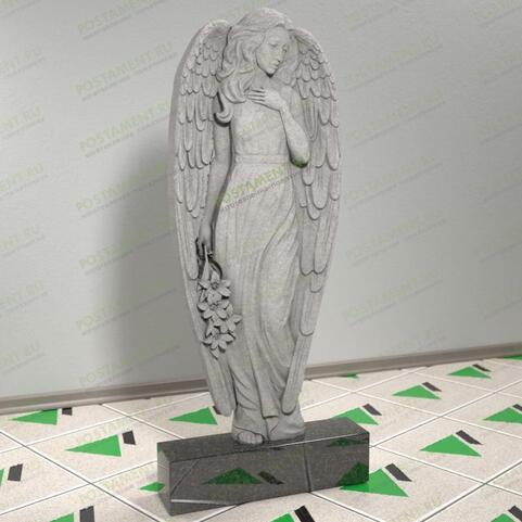 На чёрном, массивном постаменте в полный рост установлена светлая, воздушная фигурка ангела с цветами в руках. Статуя на могилу изготовлена из натурального камня. Ангел олицетворяет печаль, страдания, а также чистоту невинной души. Эта фигурка небесного посланника будет уместна на женских и детских захоронениях. Для изготовления скульптуры на кладбище стоит выбрать благородный габбро-диабаз, гранит или мрамор.