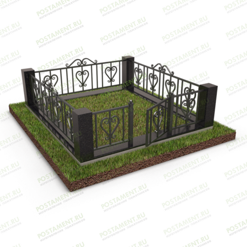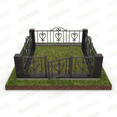 Цоколь на могилу в Москве и области с установкой по периметру участка на бетонную подушку, изготовлен из прочного, чёрного, карельского гранита. По углам ограды крепятся гранитные столбы, высотою 60 сантиметров. Между ними, в пролётах крепят металлические секции, по высоте равные 45 сантиметров. Калитка расположена в центре узкой части участка. Узоры в виде сердечек украшают ограду, наделяя её ажурностью, красотой. Помимо защиты участка от посторонних, металлическая ограда и цоколь из гранита, выполняют декоративную функцию, поэтому ограждение следует заказывать вместе с памятником и другими деталями.