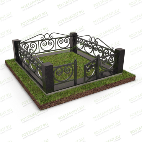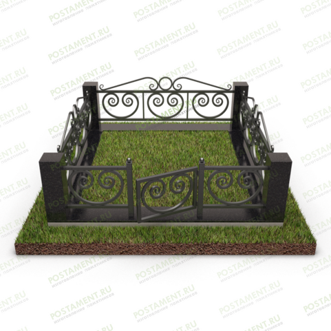 Прочный цоколь из Габбро-Диабаза, укладывается по периметру участка. Рекомендуется подготовить для него бетонное основание, это увеличивает срок службы ограды и придаёт участку богатый, привлекательный вид. По углам захоронения устанавливаются каменные столбы, сечением 15х15 сантиметров, и высотой 60 сантиметров. Металлическое ограждение высотой 45 сантиметров, выполнено из крупных завитков и колец, приваренных к прямой перекладине, по верхнему краю. Использование аналогичных, кованых элементов, при изготовлении лавочки и столика, придаст сбалансированный, гармоничный вид захоронению.