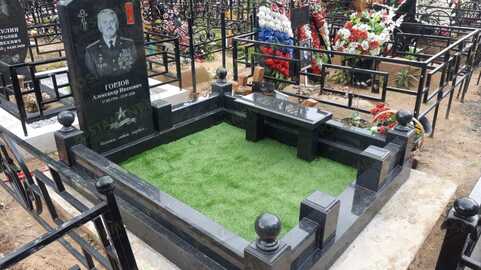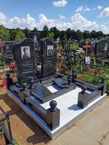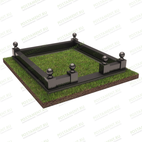 Цоколь на могилу изготовлен из черного габбро-диабаза. В комплект входят пять столбиков сечением 15х15 см высотой 30 см, между ними уложены поребрики сечением 10х15 см, три гранитных кубика 15х10х5. Пять шаров из гранита диаметром 9 см устанавливаются на столбики и придают завершенность всей композиции.