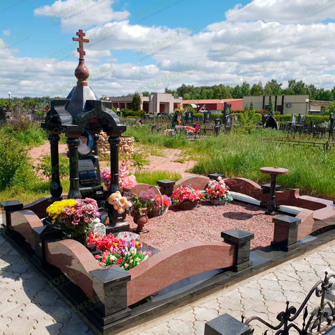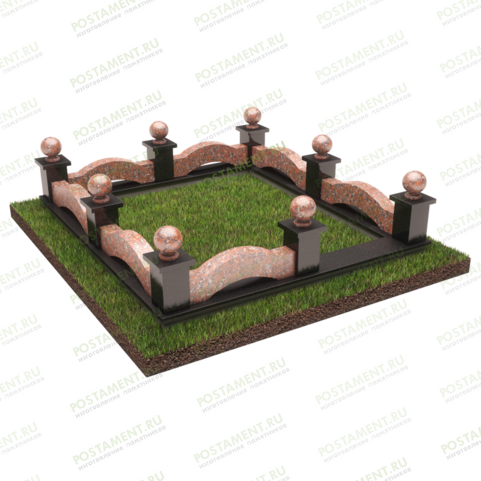 Цокольная ограда из габбро-диабаза и капустинского гранита отличается простотой и изысканным видом благодаря использованию двух наиболее прочных и красивых пород камня. Ограда сочетает черные гранитные столбы высотой 20 см с массивными шарами из гранита красного цвета. Фигурные поребрики имеют выгнутое очертание в средней части по верхней и нижней кромке.