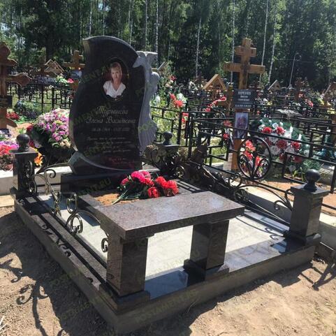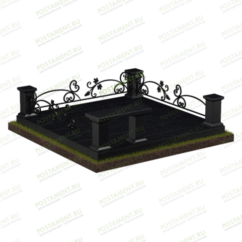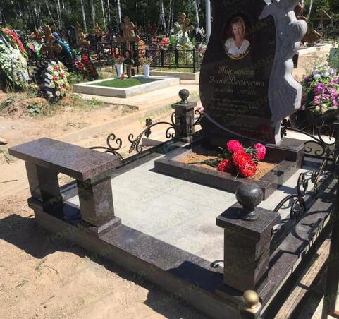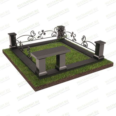 Изящный цоколь на могилу из гранита и декоративных кованых элементов придает захоронению необычайно утонченный и воздушный вид. Эффект достигается сочетанием массивных гранитных столбов из габбро-диабаза размером 30х15х15 см и ажурного заполнения проемов. На столбах установлены кубики 5х20х20 см с выбранной фаской по нижней грани.
