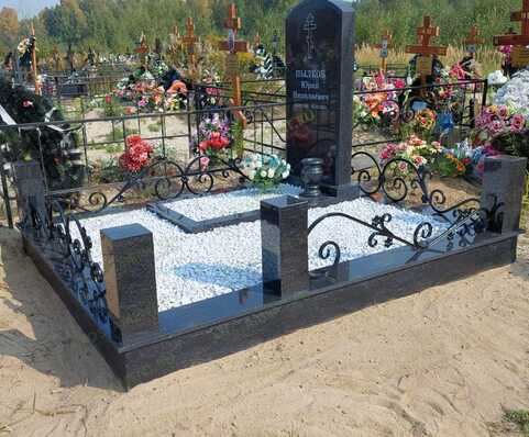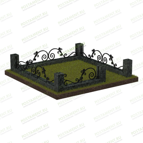 Комбинированная ограда на могилу из гранита сопка Бунтина и декоративных кованых деталей привлечет внимание заказчиков, решивших придать захоронению эксклюзивный вид. Этому способствует зеленовато-черный оттенок камня, из которого выполнены пять столбиков высотой 40 см и гранитный бордюр высотой 10 см, установленный по периметру участка. А также декоративные кованые элементы в форме изогнутых вензелей высотой 30 см, приваренные попарно в проемах между столбами, за исключением места входа с правой стороны.