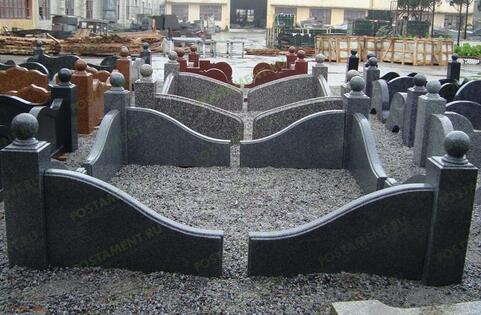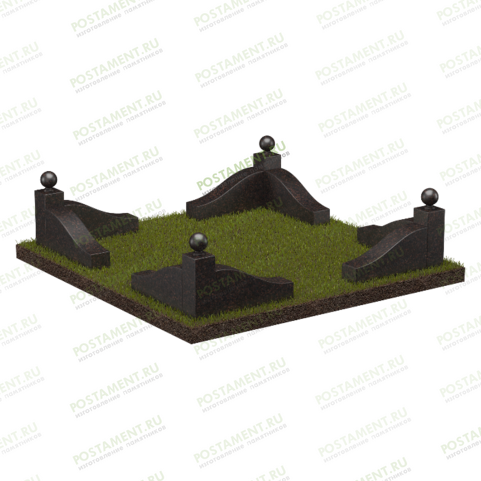 Универсальный цоколь на могилу из дымовского гранита можно купить для установки на одиночное захоронение, а также с расчетом на увеличение площади участка впоследствии. Ограждение включает четыре массивных гранитных столба высотой 40 см, увенчанные гранитными шарами диаметром 11 см, и восемь поребриков в форме полуволны размером 60х30х15 см. Элементы цоколя располагаются в виде четырех симметричных групп по углам участка.
