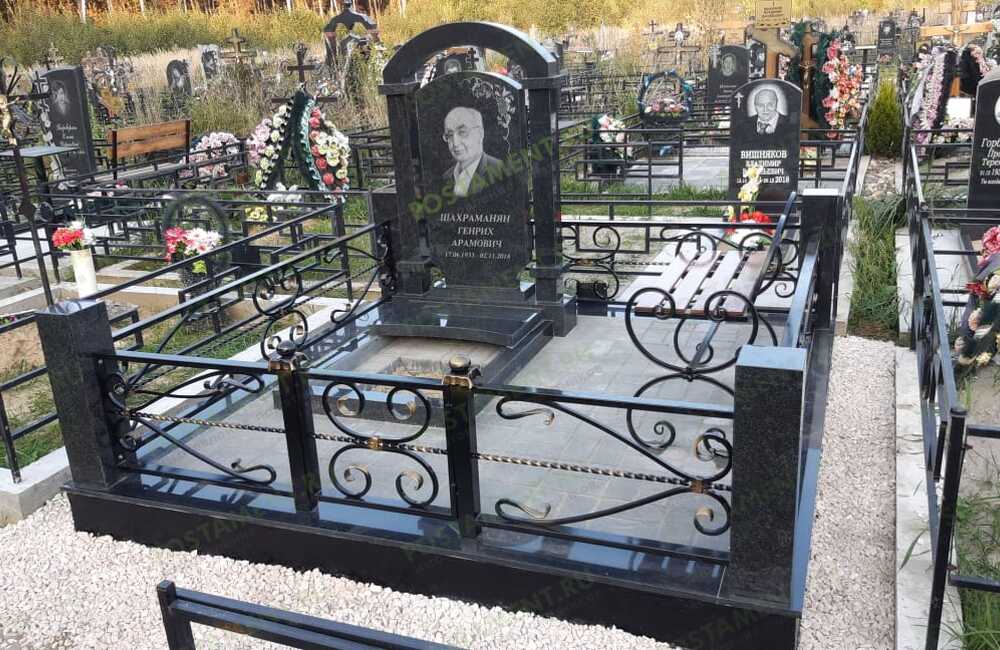 Цоколь из габбро с оградой и памятником-арка