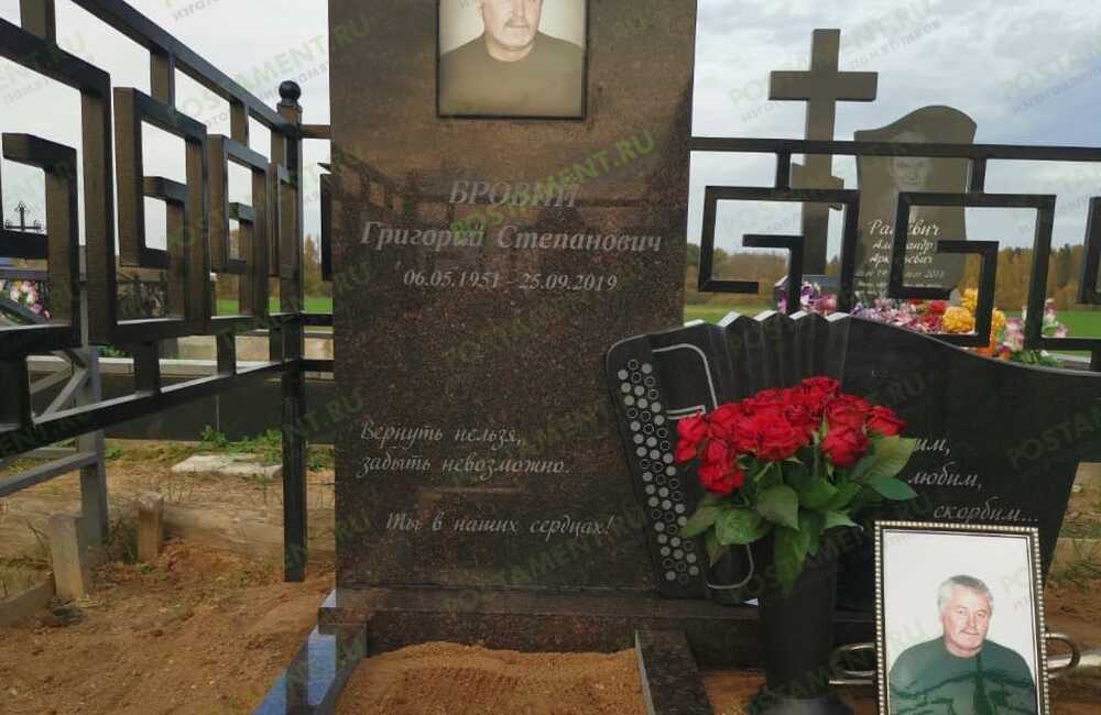 Памятник музыканту с гармонью из гранита габбро